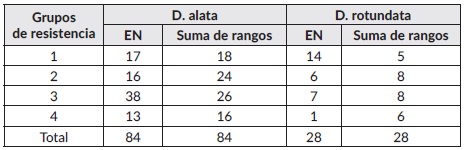 El método de suma de rangos del área bajo la curva permitió clasificar con mayor claridad las accesiones de las dos especies en los cuatro grupos de resistencia, identificándose en la especie D. alata 18 accesiones resistentes, 24 moderadamente resistentes, 26 moderadamente susceptibles y 16 susceptible. En las 28 accesiones de D. rotundata, seis fueron resistentes, ocho moderadamente resistentes, ocho moderadamente susceptibles y seis susceptibles.