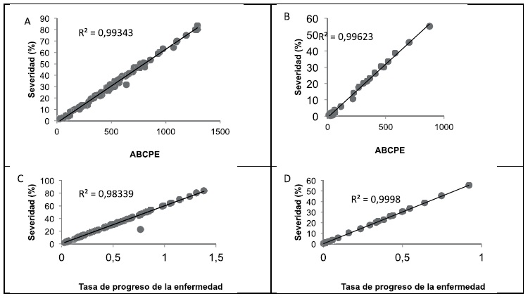 Finalmente, se determinó la relación lineal entre los parámetros de la enfermedad, escala de severidad, ABCPE y la tasa de progreso de la enfermedad. Este análisis fue realizado con el programa estadístico SAS (Statical Analysis Software) versión 9.4.