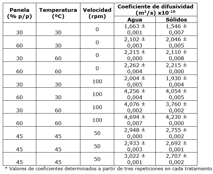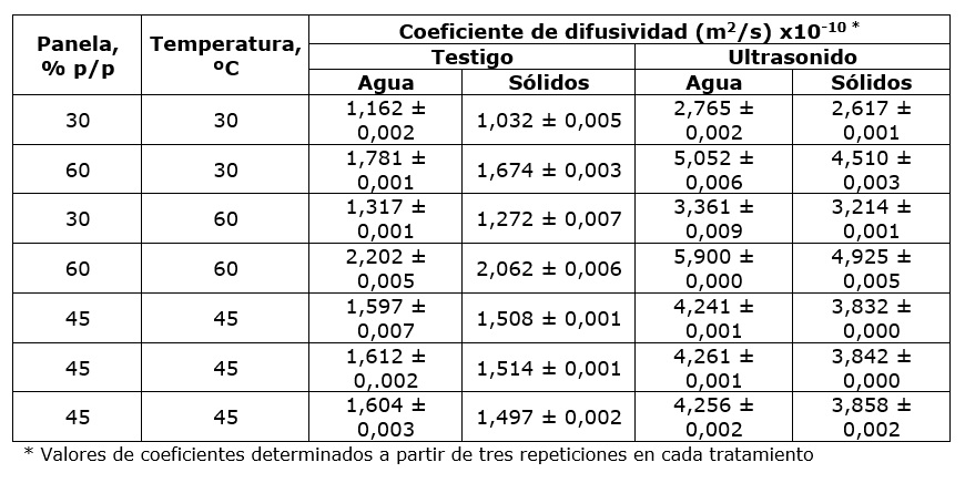 En el cuadro 3 se muestran los coeficientes difusivos tanto del agua como de los sólidos en los tratamientos testigo y ultrasonido respectivamente, mientras que en el cuadro 4 se presenta para el tratamiento con agitación.