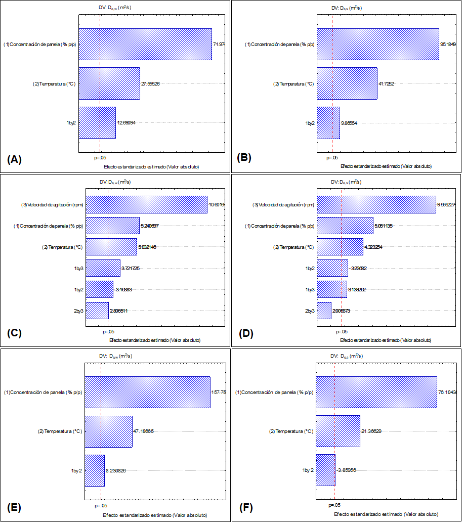 La Figura 3 muestra los gráficos de Pareto para De,w y De,s, donde se aprecia el efecto de las variables independientes. Se aprecia que la agitación no ejerce efecto significativo (p>0,05) de manera lineal sobre De,w y De,s y de manera interaccionada con la temperatura para De,s, lo que no ocurre para el tratamiento testigo y el con aplicación de ultrasonido.