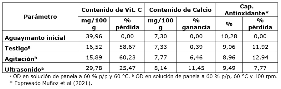Los valores de vitamina C, calcio y capacidad antioxidante del aguaymanto sometido a OD en soluciones de panela se presenta en el cuadro 5, para los 3 tratamientos empleados. Los porcentajes que se presentan están calculados en base a las concentraciones del aguaymanto fresco sin deshidratar.