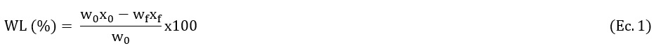 En las que y representan el peso de la muestra antes y después del proceso de OD respectivamente; y representan respectivamente la fracción de agua antes y después del proceso de OD y se expresan en base seca; y representan la fracción de sólidos presentes en las muestras antes y después del proceso de OD.