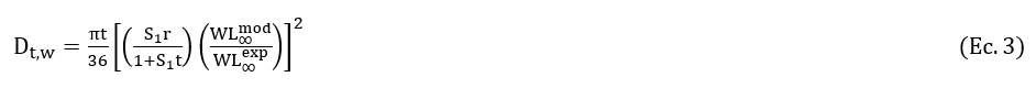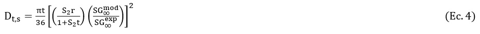 La determinación de De,w y De,s se realizó empleando el modelo matemático que propone Azuara et al., (1992) y que está desarrollado para una geometría esférica de acuerdo con las ecuaciones 3 y 4. Este modelo es un modelo empírico cuya ventaja radica en que no se hace necesario alcanzar el equilibrio para poder predecir sus parámetros, puesto que está basado en el ajuste entre la ecuación y los datos experimentales, además que no toma en consideración aspectos como la estructura del material (Giannakourou et al., 2020).