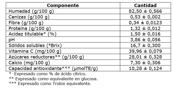 En la caracterización fisicoquímica del aguaymanto (cuadro 2) destaca su alto contenido de vitamina C (39,96 mg/100 g), azúcares reductores (28,01 mg/100 g), calcio (7,30 mg/100 g) y capacidad antioxidante (10,28 µmolTE/g).