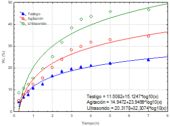 Las curvas de la cinética de OD se presentan en las figuras 1 y 2 para WL y SG respectivamente para los tres tratamientos. Estas curvas corresponden a los tratamientos más rigurosos del diseño experimental (panela al 60% p/p, 60 °C y velocidad de 100 rpm para agitación y panela al 60% p/p a 60 °C para ultrasonido y testigo).