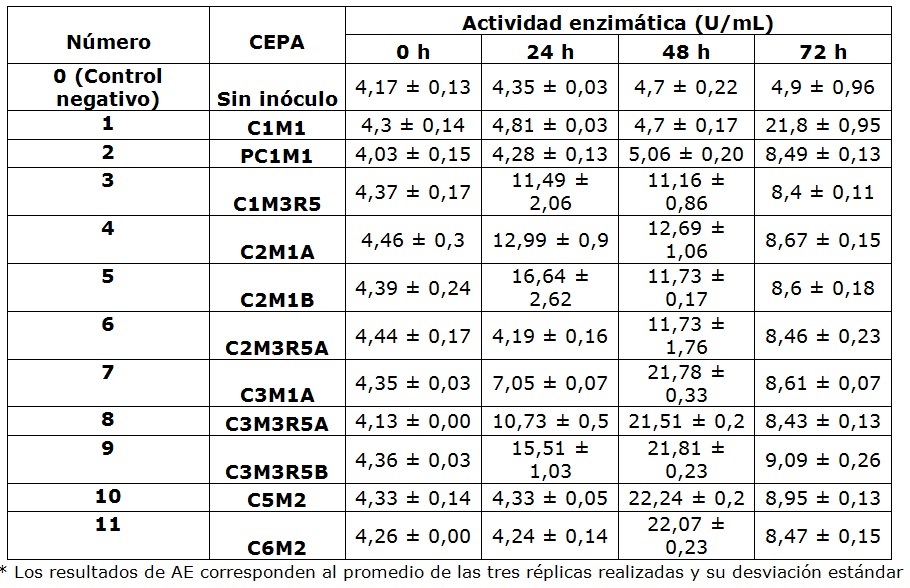 La producción de celulasas de las 5 cepas seleccionadas, en general, fue mayor a la reportada para otros microorganismos evaluados en medios formulados a partir de CMC. Hossain et al. (2021) obtuvieron la máxima actividad de celulasas por Pseudomonas sp. de 0,156 U/mL luego de 48 horas de fermentación, Da Silva et al. (2021) lograron una producción de 0,493 U/mL para las enzimas producidas por Bacillus licheniformis a las 96 horas de cultivo y Kazeem et al. (2017) obtuvieron una actividad CMCasa de 0,33 U/mL a partir de B. licheniformis 2D55 a las 18 horas de fermentación.