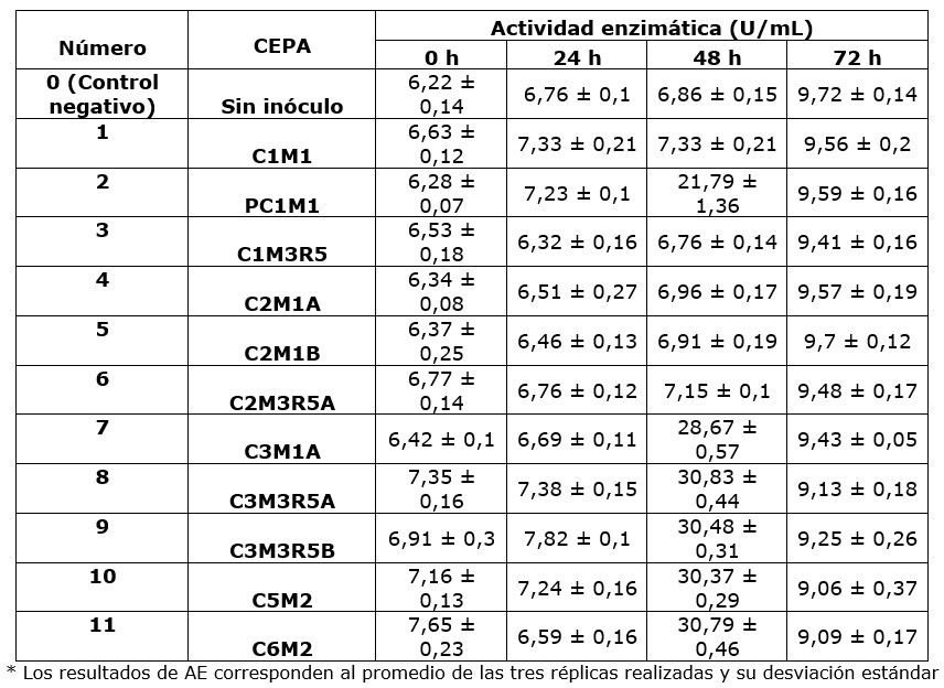 11 cepas bacterianas previamente aisladas de residuos orgánicos generados en plazas de mercado (Sánchez and Heredia, 2022) fueron cultivadas en 50 mL de caldo Mandels (Carboximetilcelulosa - CMC 1 %; (NH.).SO. 0,14 %; KH.PO. 0,15 %; Urea 0,03 %; CaCl.·2H.O 0,04 %; MgSO. 0,03 %; Peptona 0,075 %) asegurando una concentración bacteriana inicial correspondiente al tubo número 2 de la escala de McFarland. Los cultivos se llevaron a 37 °C y 120 rpm por 72 horas tomando muestras para determinar la actividad enzimática cada 24 horas.