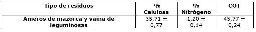 Los resultados del contenido de celulosa, nitrógeno y COT para los residuos de ameros de mazorca y vainas de leguminosa generados en plazas de mercado se presentan en el cuadro 3. El porcentaje de celulosa determinado es comparable al reportado para otros residuos agroindustriales utilizados en la producción de enzimas como paja de trigo, paja de arroz, caña de maíz y pastos (Sooch et al., 2019).