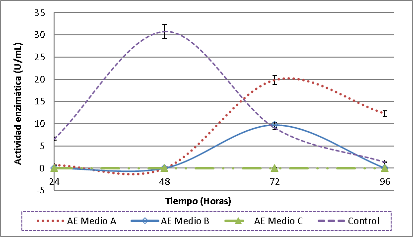 Por el contrario, en el medio elaborado a partir de residuos licuados y sin deshidratar (medio C) no se registró AE durante las 96 horas de fermentación (Figura 1), evidenciándose que el pretratamiento de los residuos mediante troceado y deshidratación, probablemente favorece la disponibilidad de celulosa en el medio permitiendo una mayor producción de celulasas por C6M2. Otros estudios también han evidenciado que el pretratamiento físico de los residuos agroindustriales promueve la obtención de celulasas (Waghmare et al., 2018), incluso en algunos casos se han realizado hidrólisis alcalinas buscando una mayor disponibilidad de la celulosa. A pesar de que en el presente estudio no se hidrolizaron previamente los residuos, se lograron mayores AE que en otros donde estos si fueron sometidos a pretratamientos químicos (Kazeem et al., 2017; Gunam et al., 2019).