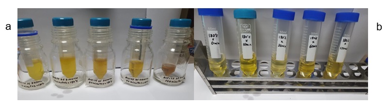 Los aceites obtenidos y el aceite de soya se sometieron a calentamiento convencional, realizado en una manta calefactora, con rango de temperatura de 0 a 450 °C, con control de temperatura digital. Se realizó en tres etapas: primero, en un recipiente de acero inoxidable se tomaron 100 mL de cada aceite y se sometieron a un tratamiento térmico a diferentes temperaturas de 20, 120, 150, 180 y 200 °C; segundo, 100 mL de cada muestra se sometió a un tratamiento térmico a 180 °C a diferentes tiempos de calentamiento desde 0, 10, 30, 60 y 120 min y tercero, cada muestra de aceite de soya, zapallo y calabaza se llevaron a calentamiento hasta 240 °C por 120 minutos para la determinación de composición de ácidos grasos, ya que a esa temperatura se observan cambios en los ácidos grasos en aceites comestibles (Bhat, 2022) y el tiempo es el que comúnmente utilizan en frituras con aceites recalentados.