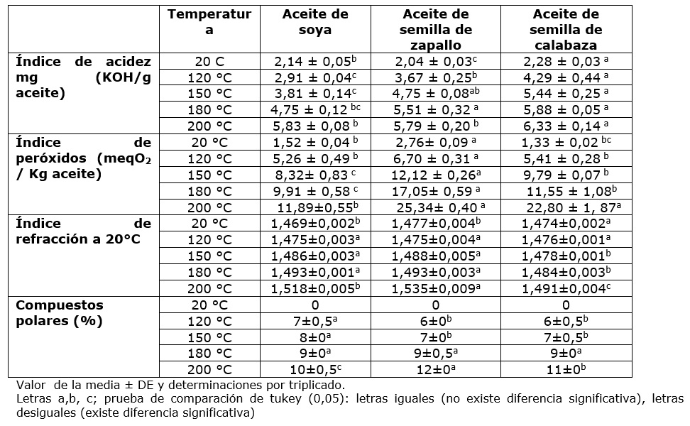 Los compuestos polares de las muestras de aceite (cuadro 1) presentan diferencia significativa entre aceites; estos compuestos se incrementan en función a la temperatura de exposición, el aceite de soya presenta menor formación de compuestos polares en comparación con los aceites de semilla de zapallo y semilla de calabaza, estos resultados puede atribuirse a su contenido de ácidos grasos polinsaturados, los aceites de semilla de zapallo y semilla de calabaza presentan mayor contenido de componentes polares y mayor contenido de ácidos grasos poliinsaturados; en otro estudio similar en aceites vegetales sometidos a calentamiento hasta 250 °C encontraron una correlación de 74 % entre el contenido de ácidos poliinsaturados y formación de compuestos polares (De Alzaa et al., 2018).