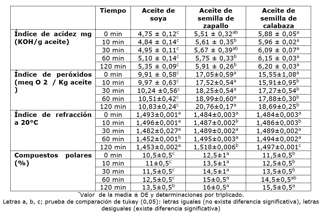 El índice de acidez (cuadro 2) a una temperatura 180 °C a los 0 min presenta diferencia significativa entre las muestras de aceite de soya, aceite de semilla de calabaza y aceite de semilla de zapallo, y a mayor tiempo de exposición se va incrementando el valor del índice de acidez. El aceite de semilla de calabaza presenta mayor valor, seguido de aceite de semilla de zapallo y el menor es el aceite de soya. Estos valores de índice de acidez se encuentran altos de acuerdo a las recomendaciones del Codex-Stan 210:1999, por lo que se puede precisar que para consumir no sería recomendable calentar por encima de 180 °C en los tres tipos de aceites estudiados.
