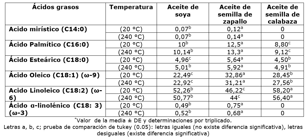 Cuadro 3. Composición de ácidos grasos de los aceites de soya, semilla de zapallo y semilla de calabaza, sometidas a 240 °C durante 120 minutos.