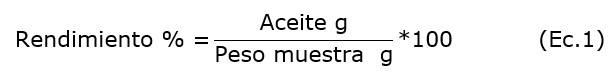 Esta investigación aplicó la extracción con CO. supercrítico debido a la naturaleza lipofílica de los AE. Se utilizó un equipo SFE-500 marca Waters con celda de 500 mL, bomba de alta presión, dos separadores, tiempo de extracción de 150 minutos y flujo de CO. de 30 g/min. Para evaluar el efecto de las variables presión (entre 150 y 300 bar) y temperatura (entre 40 y 60 °C) en el rendimiento global (Ec. 1), se aplicó un diseño experimental 2.con cuatro repeticiones por tratamiento y un criterio de significancia p< 0,05. El rendimiento se optimizó mediante un modelo central compuesto rotacional con metodología de superficie de respuesta. Se utilizaron lotes de 150 g de material vegetal seco al que se le determinó la humedad de acuerdo con la Norma Internacional AOAC (Official Methods of Analysis). El material se trituró en un molino industrial (TRF 400 Súper, Brasil) y se tamizó hasta un diámetro promedio de partícula de 0,6 mm. Indice de refracción y densidad se calcularon de acuerdo con las normas NTC 289 y 336, respectivamente (ICONTEC, 2019, 2016). Los AE se almacenaron a 4±0,5 °C.
