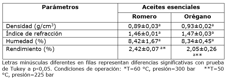 Cuadro 1. Características físicoquímicas y rendimiento de los AE extraídos con fluídos supercríticos.