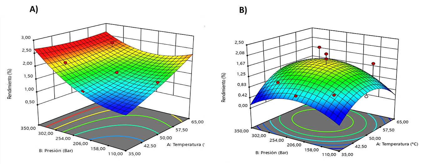 Figura 1. Diagramas de superficie de respuesta del rendimiento global de A) AER y B) AEO.