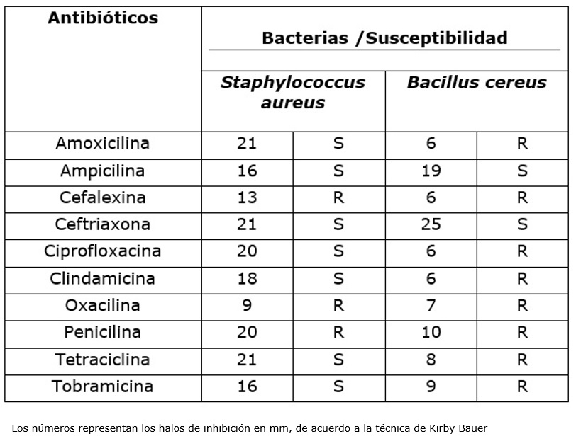 Cuadro 3. Antibiograma de S. Aureus y B. Cereus aisladas de trucha arco iris.