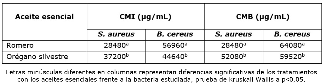 Los resultados mostraron una mejor respuesta del AER frente a la inhibición de S. aureus, representada en una CMI menor en un 23,4 % con respecto al AEO. La CMB exhibida por el AER frente a esta bacteria patógena es 45,3 % menor en comparación con el AEO, lo cual sugiere un significativo efecto bactericida del aceite esencial de romero.
