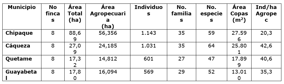 En el estudio realizado en Monteverde (Costa Rica), también relacionado con árboles dispersos en medio de paisajes agropecuarios, se encontró que para 237 ha de pastos habían 5.583 árboles de 190 especies, lo que arrojó una densidad media de 25 árboles/ha (Harvey and Haber, 1998). Esta cifra resultó mayor que la obtenida para las fincas del municipio de Chipaque con 20,3 árboles/ha; sin embargo, las cifras obtenidas para los otros tres municipios resultaron considerablemente mayores con 35,3 árboles/ha para Guayabetal, 40,6 árboles/ha para Quetame y 42,6 árboles/ha para Cáqueza. De acuerdo con lo anterior, resulta conveniente implementar acciones que mejoren la densidad de árboles en el municipio de Chipaque si se tiene en cuenta que estos árboles dispersos son importantes para procesos de conservación tal como se menciona en el mismo estudio en Monteverde, Costa Rica.