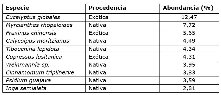 Frente a la abundancia de individuos, se encuentra que la especie Eucalyptus globulus, presenta un mayor número de árboles (417), representando el 12,47 %, seguido de la especie Myrcianthes rhopaloides, con 258 individuos (7,72 %) y, en tercer lugar, la especie Fraxinus chinensis, representada por 189 individuos arbóreos (5,65 %) (Díaz Santamaría et al., 2022). En el cuadro 7, se presentan las principales especies inventariadas, discriminadas en especies exóticas y nativas y, su porcentaje de abundancia.