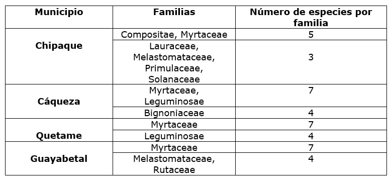 Las principales familias botánicas identificadas corresponden a Myrtaceae, Oleaceae, Melastomataceae, Lauraceae, Leguminosae, Cupressaceae, Cunoniaceae y Compositae, que representan el 67,19 % de los individuos vegetales (2.247 individuos) encontrados en las 32 fincas inventariadas. En el Cuadro 8 se señalan las principales familias botánicas en cada uno de los municipios; siendo la familia Myrtaceae es la más representativa con cerca 33,88 % de los individuos arbóreos inventariados (1.133)
