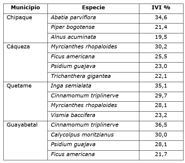 Es de señalar que en el municipio de Chipaque, la especie Eucalyptus globulus obtuvo el IVI más alto, con un 35,5 %, por su parte, la especie Fraxinus chinensis, obtuvo valores altos de IVI en los municipios de Cáqueza y Quetame, con un 29,9 y 27,5 % respectivamente.