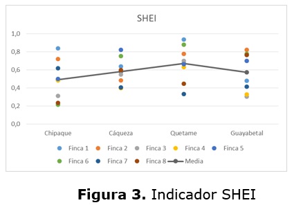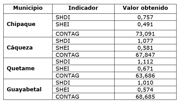 Los indicadores de paisaje calculados en la zona de estudio fueron: índice de diversidad de Shannon (SHDI), índice de uniformidad de Shannon (SHEI) e índice de contagio (CONTAG). En la Cuadro 10 se presentan los resultados de estos indicadores para las ocho fincas correspondientes a cada municipio.
