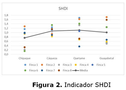 En cuanto a la riqueza del tipo de parches y a la distribución proporcional del área entre los diferentes tipos de cobertura, el municipio de Quetame presenta el mejor indicador con un SHDI de 1,112, en contraste con las fincas del municipio de Chipaque que obtuvieron un SHDI de 0,757.
