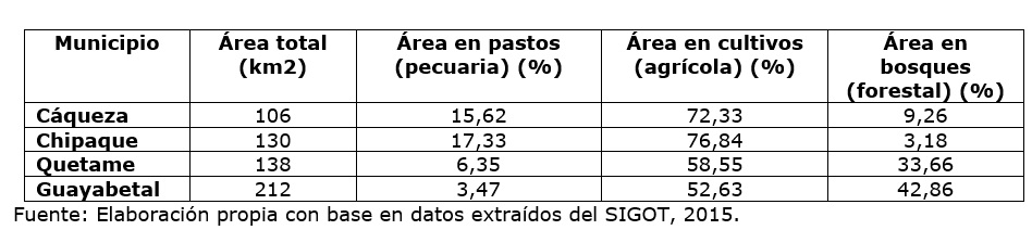 Con respecto a las coberturas del suelo en los municipios de Chipaque, Cáqueza, Quetame y Guayabetal, para el año 2015 el Sistema de Información Geográfica para la Planeación y el Ordenamiento Territorial de Colombia (SIGOT) reportaba para los municipios objeto de este estudio, coberturas de pastos entre el 3 y 18 %, mientras que el área agrícola se encontraba entre 52 y 73% aproximadamente, sin embargo, los datos de coberturas del suelo obtenidos para las 32 fincas que hicieron parte del presente estudio, arrojaron cifras mayores para la cobertura pastos con valores de 61, 73, 27 y 66 % respectivamente; con relación a la cobertura cultivos, donde los resultados fueron de 1,8, 8,6, 47 y 18 %, respectivamente. Lo anterior, se convierte en una oportunidad para realizar un nuevo estudio y saber si esta tendencia es generalizada en toda la región.