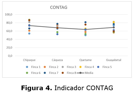 Con relación al indicador CONTAG se encontró que el mayor valor correspondió a las fincas pertenecientes al municipio de Chipaque (73,09 %) lo cual se explica por la dominancia en las fincas de 4 tipos de cobertura (PE, BA, BR, CA) que ocupan el 96 % del paisaje, mientras que el valor más bajo fue para Quetame (63,69 %) donde el 96 % del territorio lo ocupan 7 tipos de coberturas (PE, HD, CPA, CT, AA, CA, BA). Este indicador también da indicios de mejores condiciones de diversidad en cuanto a tipos de cobertura del suelo para el municipio de Quetame.