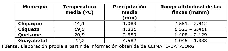 Las condiciones climáticas (Cuadro 2) son diversas en el área de estudio, pues se trata de una transición de clima frío desde el municipio de Chipaque a clima cálido en el municipio de Guayabetal.