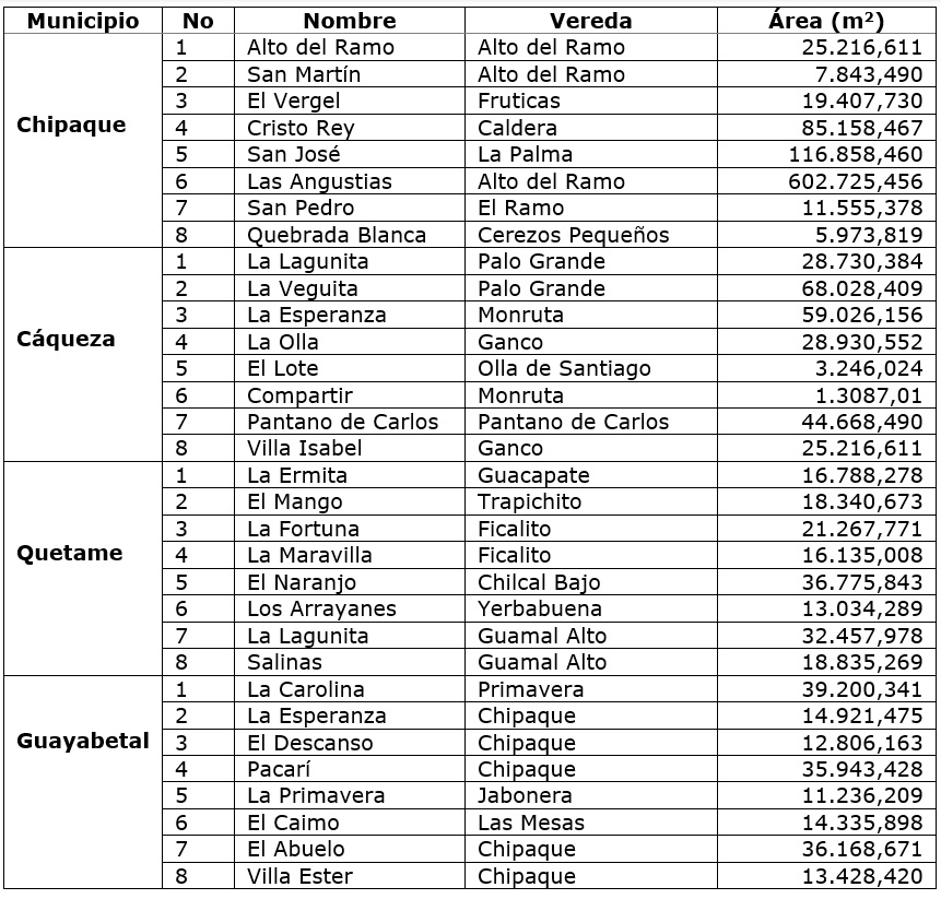 En la región andina, la fragmentación ecosistémica es atribuida a la deforestación y a la conformación de parcelas o unidades productivas, pero sin articulación ecológica principalmente (Calderón and Benavides, 2022). Como muestra de ello, los municipios de la provincia de oriente de Cundinamarca (Chipaque, Cáqueza, Quetame y Guayabetal), se caracterizan por su alta dependencia de las actividades agropecuarias, donde el 99,8 % del suelo está catalogado como rural (Katz, 2017); no obstante, es evidente la fragmentación del paisaje que se ve reflejado a su vez en el hecho que el 53,93 % de los predios que se encuentran en la región tienen áreas menores a 1 hectárea y el 33,84 % tienen áreas que oscilan entre 1 y 5 hectáreas. De igual manera, la presencia de las actividades productivas agropecuarias, incluso de la misma construcción del corredor vial Bogotá–Villavicencio, ha generado la pérdida de la capa boscosa original y, por consiguiente, de la biodiversidad y la conectividad del paisaje.