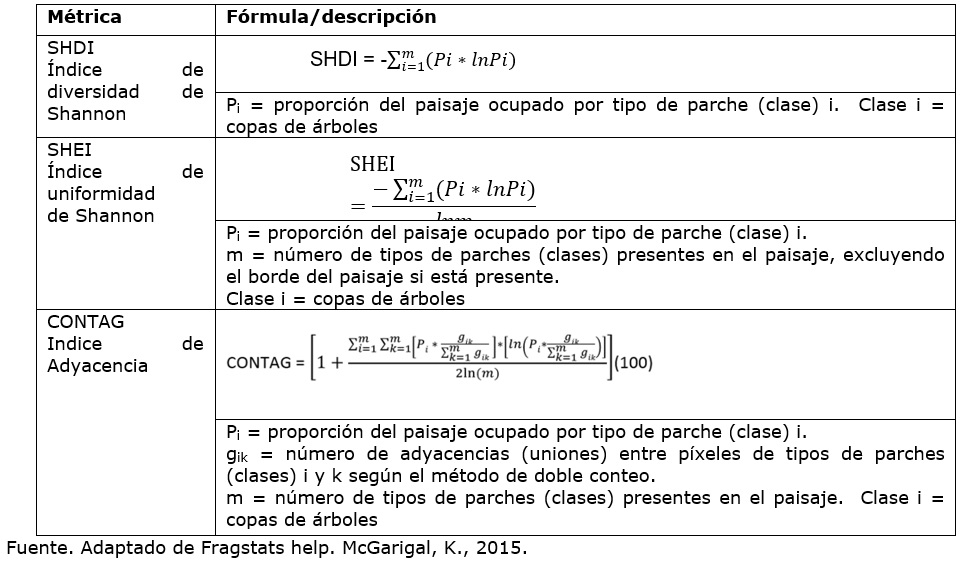 A partir de una capa raster para cada finca y mediante el software fragstats versión 4.2.1, se cuantificaron las características del paisaje para cada finca tomando como cobertura de estudio la correspondiente a las copas de los árboles (CA). Los índices calculados corresponden a algunos de los propuestos por (McGarigal, 2015) y se enfocaron en caracterizar cada clase de parche y el mosaico de parches como un todo. Los índices calculados se presentan en el Cuadro 4 y corresponden principalmente a aquellos índices que permiten realizar análisis teniendo en cuenta que se trata de fincas con áreas diferentes.