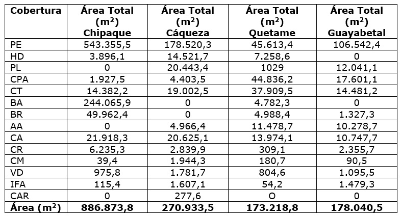 Con relación a las coberturas vegetales del municipio de Quetame y el porcentaje que representa del área total, se encontró que la cobertura con mayor extensión correspondió a PE con 26,3 % del área total; a diferencia de las fincas correspondientes a Chipaque y Cáqueza, en Quetame hay otras dos coberturas con extensión considerable, CPA y CT, con 25,8 y 21,8 % del área total, seguidas de PE y CA con una extensión de 8 % del área total.