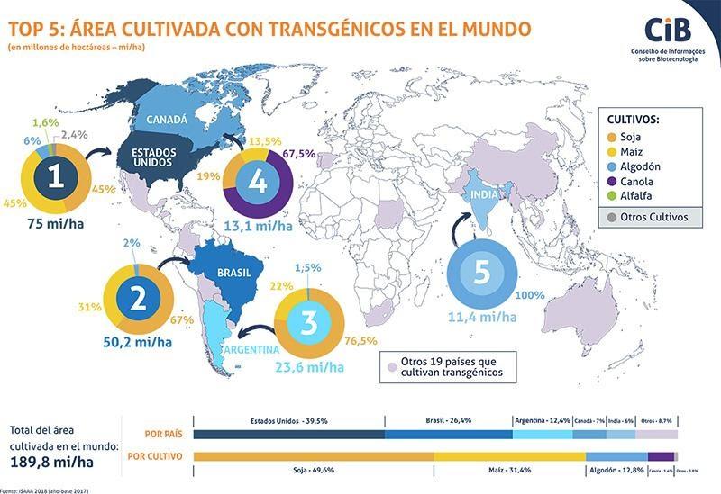 Figura 2. Los cinco países de mayor área cultivada por transgénicos en el mundo.