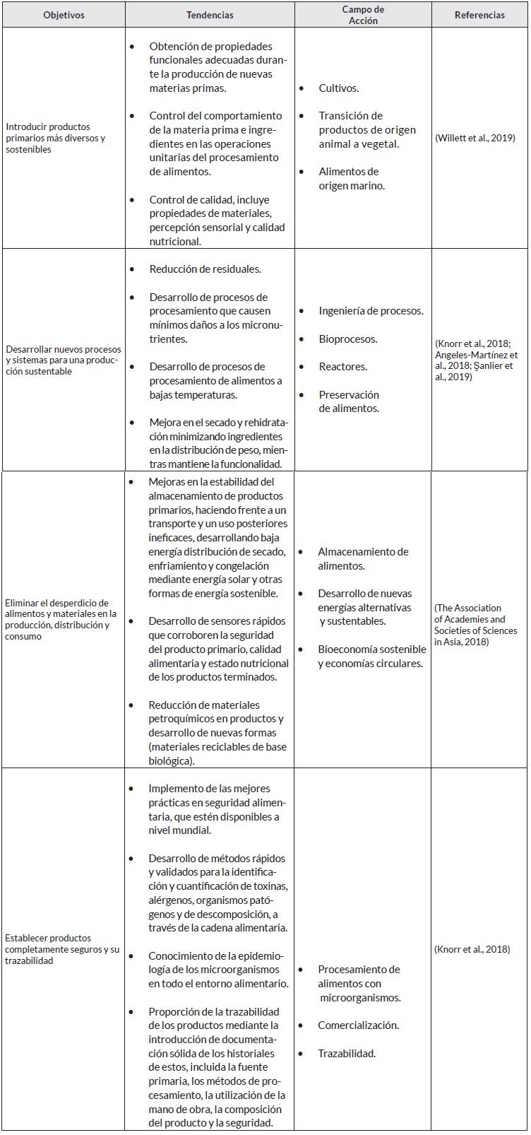 Cabe destacar que el aumento poblacional también ha generado el incremento de residuos de la industria de alimentos. Es por ello que resulta necesario la implementación de estrategias efectivas en manejo de desechos, no solo para solventar la problemática ambiental, sino también para aprovechar el potencial de estos residuos en la obtención de nuevos productos de valor agregado (Lopez y Hertel, 2021), aumentando la eficacia de sus procesos, reducir el consumo de recursos y energía y minimizar el impacto ambiental sobre el entorno. En consecuencia, el presente artículo tiene por objetivo analizar las principales tendencias y desafíos que presenta la industria de alimentos a nivel mundial frente al periodo de pandemia por Covid-19, como parte de la garantía del consumo sostenible a lo largo de toda la cadena de suministro, la equidad y la sostenibilidad ambiental.