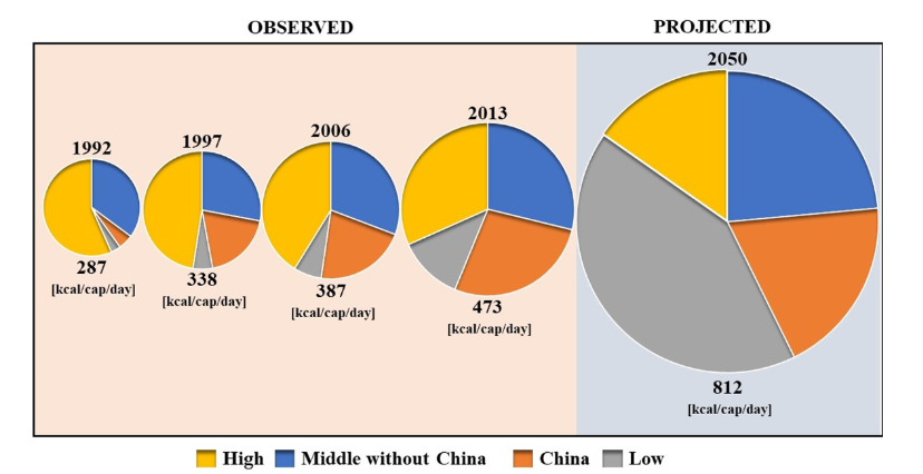 Figura 3. Desechos de alimentos per-cápita de 158 países de acuerdo a su nivel económico desde 1992 hasta 2013, así como sus pronósticos al 2050.