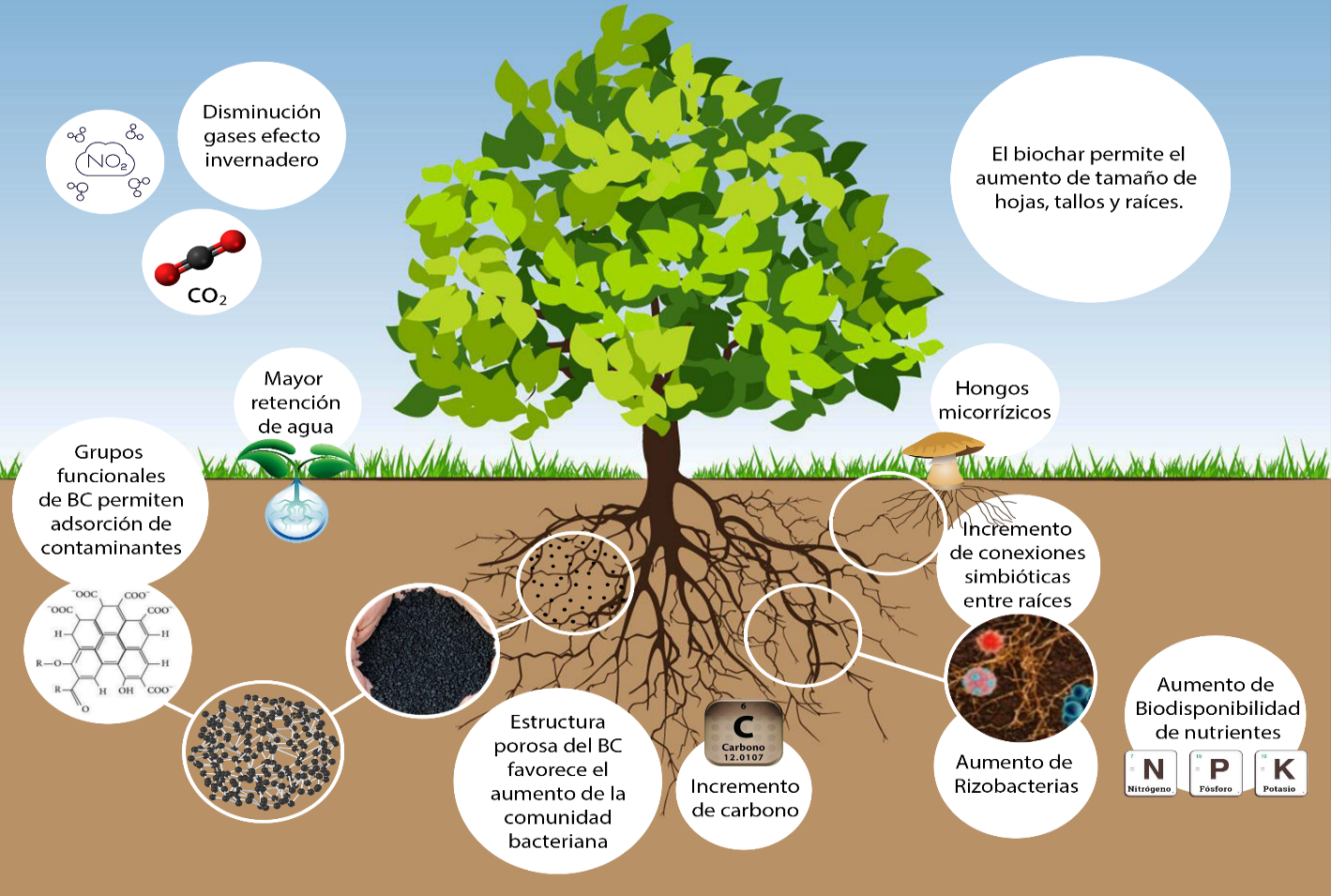 El BC constituye una enmienda efectiva para restaurar la calidad fisicoquímica de los suelos, aumentando el pH, la capacidad de intercambio catiónico, la capacidad de retención de agua, aireación, penetrabilidad de las raíces, área superficial, disminuyendo la densidad aparente, alterando las comunidades bacterianas y micorrícicas de la rizosfera; todos estos cambios positivos en el suelo derivan en mayor disponibilidad de nutrientes esenciales que incrementan la fertilidad vegetal.