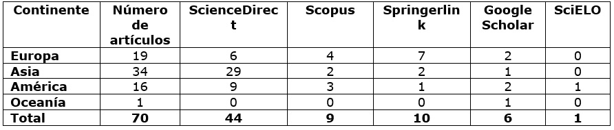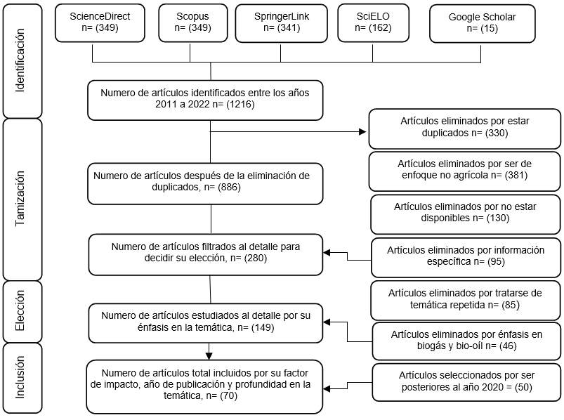 Se utilizaron cinco bases de datos y se realizó la búsqueda de artículos científicos publicados bajo las palabras clave, biochar, microorganismos del suelo, enzimas, rizobacterias, micorrizas, comunidad bacteriana, encontrando más de mil documentos y seleccionando los más importantes, fundamentándose en el factor de impacto, fecha de publicación más reciente, autores más citados, chequeando otras revisiones y metaanálisis sobre el tema, para luego de una búsqueda selectiva, analizar los artículos seleccionados y analizar las conclusiones, comparando entre ellos factores en común y diferencias. Se seleccionaron 149 y se analizaron a fondo 70 artículos relacionados con los mecanismos de interacción entre el BC y la promoción de los microorganismos del suelo, de los cuales se detallan la procedencia geográfica y la base de datos donde fueron hallados, la distribución porcentual de los artículos por año de publicación es 30, 24,3, 18,6 y 27,1 % correspondientes a los años 2022, 2021, 2020 y 2019 al 2011, respectivamente. El 48,6 % de los artículos evaluados pertenecen a la región asiática, destacándose por su amplia producción científica en este tema (cuadro 1).