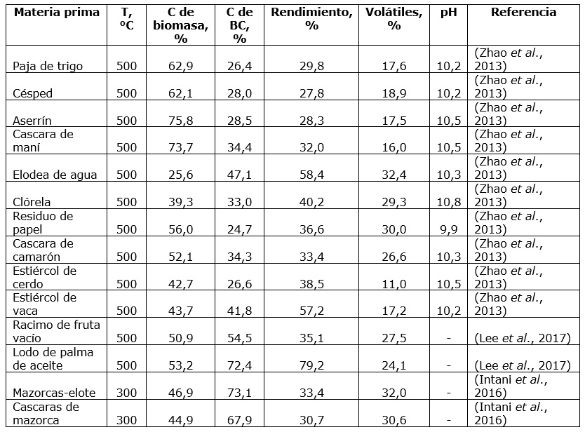 Zhao et al. (2013) y otros autores han publicado resúmenes de resultados de pirólisis lenta con diferentes materias primas de biomasa, la relación entre el contenido de carbono en la biomasa (30-40 %) y el contenido de carbono en el BC obtenido, siendo el mayor rendimiento de 79 % obtenido para el lodo de palma, y pH promedio de 10,2 (cuadro 2).