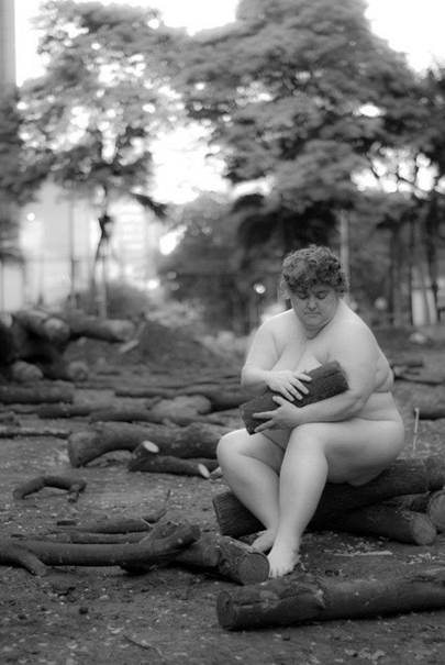 O que faço com o trabalho é impor um corpo, em geral desconsiderado, corpo entendido como um corpo “errado”, inadequado, feio, grotesco, fora das normas, um corpo que deve ser modificado. O corpo da mulher gorda é um corpo considerado doente, um corpo que não deve existir, tem que ser manipulado, controlado, cortado, extirpado (ao menos em partes) para que caiba nos moldes impostos socialmente. Portanto, quando me posiciono e me exponho nua, estou mostrando o corpo em sua dimensão e dizendo que este corpo é possível sim, existe e pode sim continuar existindo fora das formas idealizadas e, ainda assim, ser pleno. Um corpo que não quer se normatizar, se adequar, para continuar existindo e que também não vai se recolher, se esconder, se anular (como em geral acontece com as mulheres gordas). Então, sou um corpo que transgride as regras e ainda se exibe em ações performáticas. Performar foi uma forma de ir além das representações e assumir uma postura política, ativista, se expor em locais públicos, nua, e posar para fotografias e vídeos. Como ousa este corpo se fazer aparecer assim?9