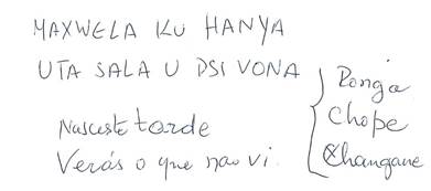 T: Para encerrar, eu gostaria que você dissesse - no meu caso, eu preciso que você escreva - algumditadoou frase em Ronga ou em Chope e traduzisse o que ele(a) significa.