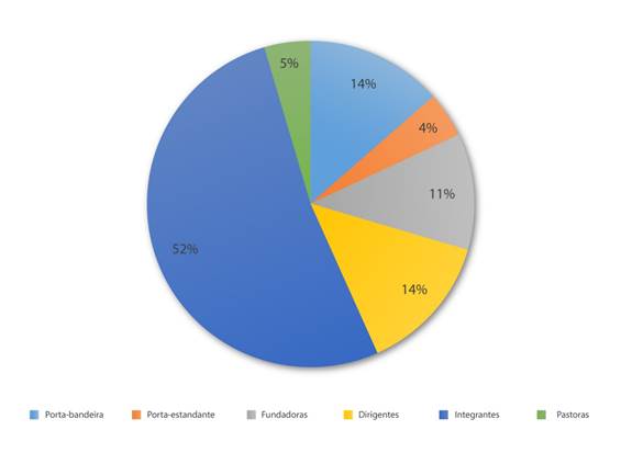 Para se ter uma ideia mais abalizada dessa participação, o gráfico 1, organizado por categoria de inserção, sintetiza essas informações. Os nomes repetidos são decorrentes de mudança de escola dessas protagonistas, o que ocorreu com as porta-bandeiras, porta-estandarte e pastoras. Certamente, essa lista não contempla todas as mulheres brincantes dessas agremiações, o que se pode constatar nas fotos das Alas que marcam a presença significativa de mulheres nos desfiles de rua (SILVA; BRAIA, 2000).17