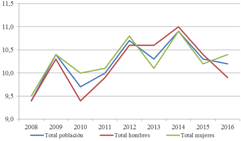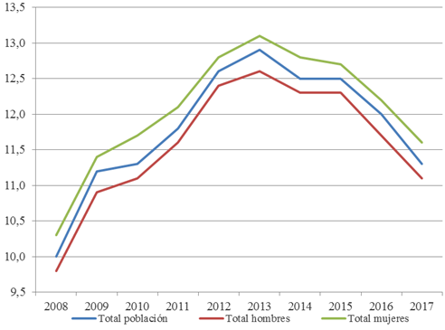 La evolución de la tasa de sobreesfuerzo económico a la vivienda, a saber, del porcentaje de población cuyos costes residenciales son superiores al 40% de los ingresos del hogar, confirma la crisis que sufre una creciente parte de la sociedad española. Entre 2008 y 2014, dicho indicador tuvo una clara tendencia alcista, y solo fue a partir de 2014 que empezó a remitir paulatinamente (Gráfico 3). Por sexos, el porcentaje de mujeres en situación de sobreesfuerzo económico fue siempre superior al de los hombres a lo largo de este periodo, excepto durante el bienio 2013-2014.