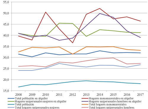 La monomarentalidad3, el alquiler, y los hogares unipersonales son variables que se asocian también con una peor relación entre costes residenciales e ingresos del hogar. El esfuerzo económico medio en el mercado de alquiler que deben realizar los hogares monomarentales y los unipersonales se ha situado a lo largo del periodo 2008-2017, por lo general, por encima del 40% de los ingresos (Gráfico 2), es decir, supera el umbral máximo por encima del cual se considera muy probable que una familia situada en los dos quintiles inferiores de renta no disponga de recursos suficientes para otras necesidades básicas como la comida, el transporte o la ropa (p. ej. CIHI, 2004; CHP, 2005, 2006; Howard CAMPBELL; Joan MCFADDEN, 2006). Al respecto, es importante tener presente que el esfuerzo económico medio de la población española que vive en alquiler es uno de los más elevados de toda Europa (Jordi BOSCH, 2015, p. 168).