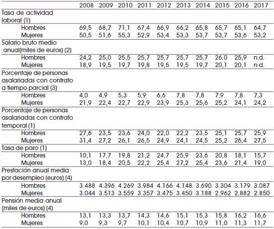 La situación económica de los individuos en el mercado residencial está fuertemente determinada por su capacidad para obtener rendimientos del trabajo y, lamentablemente, todos los indicadores confirman la peor integración de las mujeres en el mercado laboral español en comparación con la de los hombres (Tabla 1): (i) la tasa de actividad femenina sigue siendo inferior a la masculina; (ii) la tasa de desempleo y de temporalidad son sistemáticamente mayores entre las mujeres que entre los hombres; y (iii) la diferencia salarial entre sexos sigue siendo claramente favorable a los hombres. Es ampliamente conocido que las mujeres tienen menos oportunidades para promocionar laboralmente, perciben sueldos inferiores que los hombres por realizar tareas idénticas, y en mayor proporción trabajan a tiempo parcial, en muchos casos, a causa de las dificultades que encuentran para conciliar vida laboral y familiar puesto que son, abrumadoramente, las que se encargan en el ámbito familiar del cuidado de las personas mayores, de los niños y de otros familiares dependientes, y también asumen en mayor proporción las tareas domésticas (AMNISTÍA INTERNACIONAL ESPAÑA, 2015, 2017). Además, una consecuencia directa de esta menor y peor calidad de la participación de la mujer en el mercado laboral son las inferiores prestaciones por desempleo y pensiones que percibe (Tabla 1), lo cual favorece la cronificación del riesgo de exclusión de la mujer a lo largo de su vida.