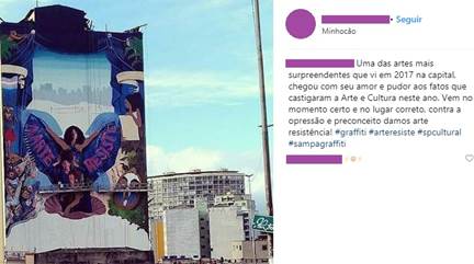 O engajamento da audiência, produzindo dialogicamente Linn e sua visibilidade, foi por nós observado quando passamos a seguir a hashtag #arteresiste. Observamos então os fluxos de relações que passaram a ocorrer a partir da imagem do mural denominado “MURAL RESISTIR E EXISTIR 2017”, localizado no Elevado Presidente João Goulart, conhecido popularmente como “Minhocão”, na cidade de São Paulo/SP. Grafitado por Patrick Rigon e Renan Ilustrador, o mural é fruto da campanha da já referida empresa, e ele representa, segundo descrição, “uma celebração da resistência diária da comunidade Trans para construir uma sociedade livre, onde todas as pessoas possam ser o que se é” (ABSOLUT VODKA, 2017). No centro do grafite se apresenta a imagem de Linn da Quebrada, ao lado de Assucena Assucena e Raquel Virgínea, dentre outras, acrescida de frases, desenhos e elementos estéticos relacionados à “resistência”. Com ele, pessoas variadas passaram a interagir com o mural, tirando fotos de si e postando na plataforma do Instagram, trazendo à tona o debate sobre gênero e sexualidade a partir de questões envolvendo direitos da população trans. Por meio da produção de fotos marcadas pela hashtag, também aderiam ao movimento de “arte e resistência”, em oposição aos esforços de censura.