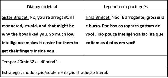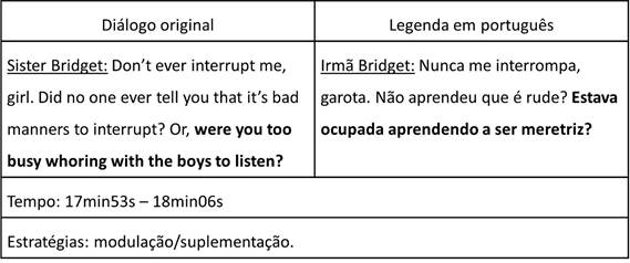 Com a sentença Were you too busy whoring with the boys to listen? (Estava muito ocupada se prostituindo com os garotos, para ouvir?), a personagem Irmã Bridget, madre superiora da instituição, se refere à penitente novata Margaret, vítima de estupro, como prostituta. Na tradução desta sentença para o português “Estava ocupada aprendendo a ser meretriz?” (Were you too busy learning to become a whore?), nota-se que o termo whoring (se prostituindo) foi traduzido como ‘aprendendo a se prostituir’. O emprego deste procedimento de tradução indica uma variação de perspectiva que resultou na atenuação da conotação sexual do termo tabu1whoring.