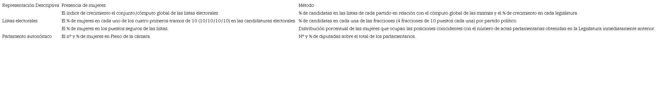 La base documental que se ha empleado para hacer este estudio ha sido, principalmente, fuentes primarias como: 1) la normativa de los partidos políticos (ej. los estatutos de los partidos), 2) la legislación existente en cuanto a igualdad de género (ej. legislación autonómica y nacional), y 3) la composición de las listas electorales y del parlamento autonómico (ej. Boletín Oficial de la Comunidad Autónoma, y listado de parlamentarios autonómicos y de la composición de los órganos de la cámara). Aunque también se ha revisado fuentes secundarias al acudir a una buena parte de la literatura especializada en la materia, y algunos estudios de género previos sobre la materia objeto de esta investigación.