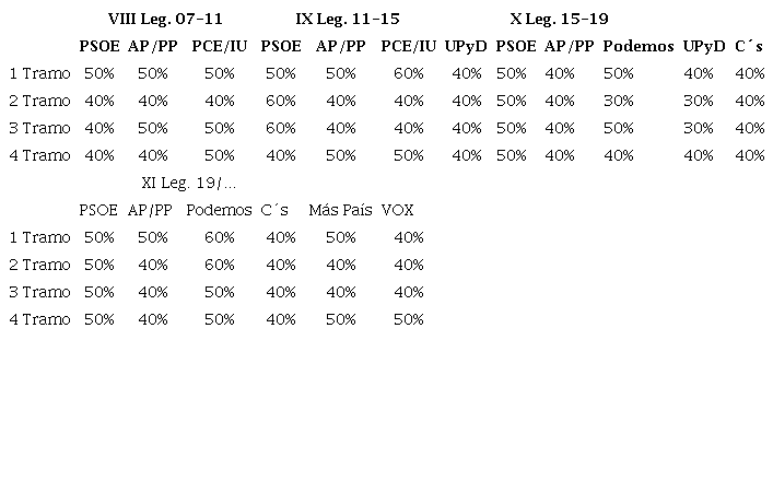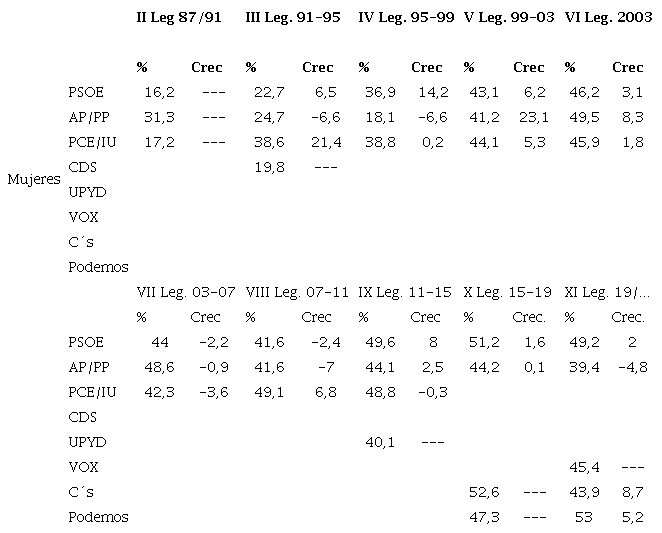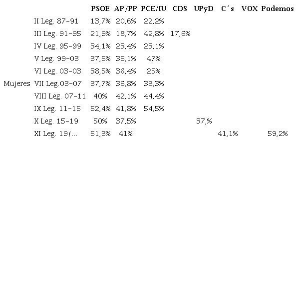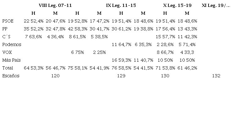 En todo caso, las medidas de paridad han tenido un efecto positivo en incrementar el número de mujeres en este parlamento autonómico. Tal es así, que en la XI Legislatura (2019-…) las mujeres del PSOE se sitúan en un porcentaje del 48,6%, las del PP del 43,3%, las C´s del 42,3%, las Podemos del 71,4%, las de Más País del 50%, y las de Vox del 33,3%. Todos los partidos, los que tienen cuotas y los que no, han superado la barrera del 40% de representación femenina en el parlamento autonómico. Con lo cual, el hecho del que el PP se equipare a los porcentajes del PSOE responde, como ya se ha hecho mención, por un lado, al efecto contagio que experimenta este partido, y por otro, a la voluntad que tiene la propia dirección del partido por incorporar mujeres entre los primeros puestos de la lista; pero también a que a medida que las mujeres se integran en cierto número en la cámara puede impulsar la presencia de algunas otras. El caso de Podemos y Más País obedece a las ideas de paridad que defienden ambas organizaciones políticas, pero también a la propia Ley de Igualdad, al igual que C´s y Vox.